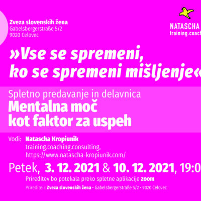 “Vse se spremeni, ko se spremeni mišljenje” Spletno predavanje in delavnica z Natašo KropiunikPrireditev bo potekala preko aplikacije zoom pod sledečim linkom: https://us02web.zoom.us/j/83982749449. Delavnica je namenjena vsem, ki želijo pridobiti nekaj impulzov in idej in hočejo izvedeti, kako si s tem lahko olajšajo vsakdan ter še bolj spoznajo same(i) sebe: – kaj pomeni biti mentalno močna?– kako […]