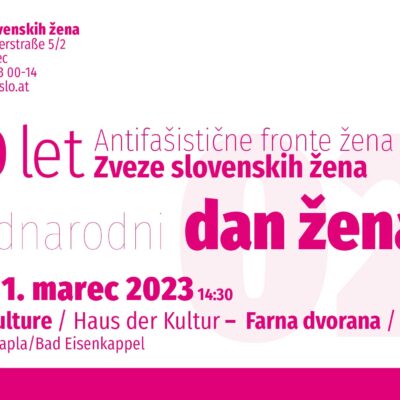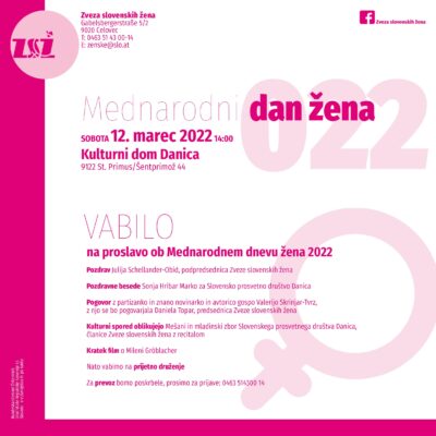 Po letu odmora ZSŽ spet vabi na tradicionalno proslavo ob mednarodnem dnevu žena, tokrat v Kulturni dom SPD Danice v Šentprimož. Pripravile smo pester program in se veselimo svidenja z vami! Pozdrav: Julija Schellander-Obid, podpredsednica Zveze slovenskih žena Pozdravne besede: Sonja Hribar Marko za SPD Danica Pogovor s partizanko in znano novinarko in avtorico gospo […]